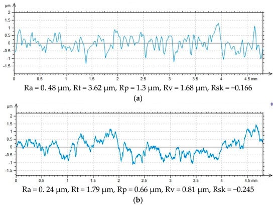 One can notice steep peaks and valleys, as proven by the profilogram of the surface before treatment (Figure 6a) and the high value of St (total profile roughness height). Shot peening produces peaks and cavities with a smaller height and rounded peaks and valleys (Figure 6b).