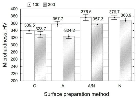 Comparing the surface topographies after degreasing (O) and vibratory shot peening (N), it can be observed that there are no significant differences in the amount of resulting micro-unevenness, as shown in Figure 8. Figure 9 illustrates the effect of surface preparation methods on obtained microhardness.