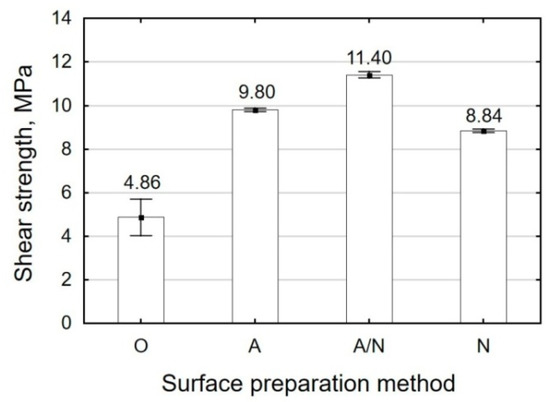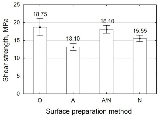 • The highest shear strength can be observed for the specimens treated by alkaline degreasing (O) (18.75 MPa) and for the specimens treated by anodizing followed by vibratory shot peening (A/N) (18.10 MPa);