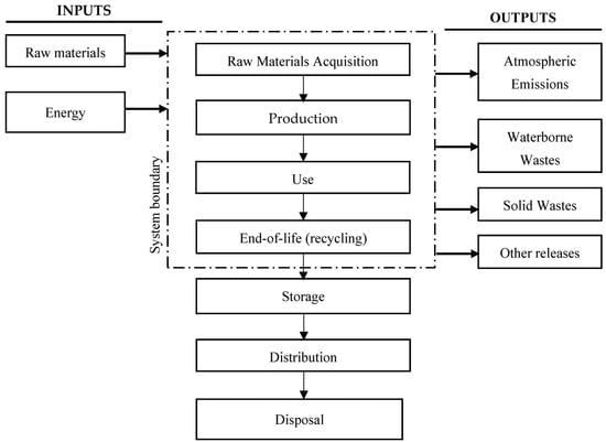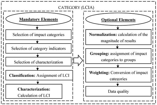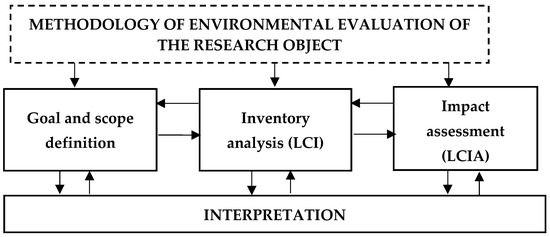 The basic steps of the LCA analysis include Figure 1: (1) the definition of the research goal and scope, (2) the identification and quantification of loads introduced into the environment, i.e., used materials and energy, as well as emissions and waste, (3) the assessment of the potential load impacts according to the life cycle impact assessment (LCIA) Figure 2 and (4) the estimation of available options to reduce the loads [42,43].