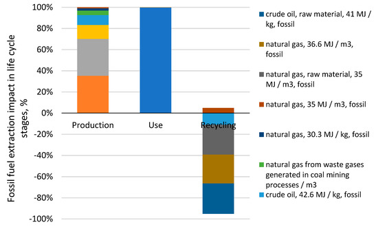 Most harmful to the environment in the fossil fuel area of a car tire’s life cycle is the depletion of natural gas and oil. A study of Chinese tires [54] has provided similar conclusions, although the analyses take advantage of a different impact assessment method (CML). The use stage was found to have the biggest impact in this area, with a value of 97.83 Pt Table 10. This stage contributes to 98% of natural gas depletion, which results mainly from the fuel consumption involved in this stage. Each change in fuel type will cause changes in the area of environmental impacts on natural resource depletion. If car fuel was replaced by electrical energy, it would be possible to reduce the impact of the car tire life cycle (especially its use stage), assuming that analyses for the energy mix are carried out in which renewable energy sources would prevail.