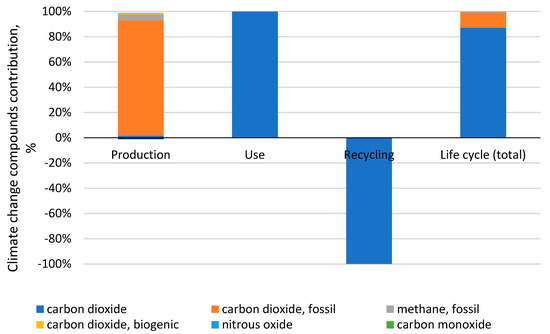 It was found that the most potentially harmful environmental impacts involved in the stage of a car tire’s use belonged to the category of compounds that cause climate changes, with a value of 12.41 Pt. Emission levels in this category were shaped mainly by carbon dioxide emissions during the use stage at 12.4 Pt, which were emissions that relate mainly to the use of fuel while driving a car. In the category of climate change, carbon dioxide (almost 99%) was found to be the most harmful. At the production stage, carbon dioxide constituted the greatest share (93.7%) Figure 8.