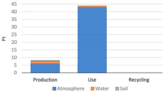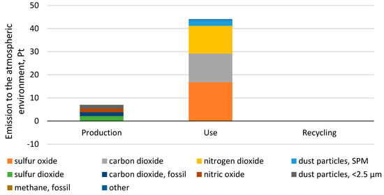 The most harmful substances affecting the atmosphere are emitted during the use of car tires, with this being 43.63 Pt Figure 9). The highest share in the generation of substances such as sulfur oxide, carbon dioxide, nitrogen dioxide, and SPM dust can be attributed to a car tire’s use stage. The largest negative impact is reported for emissions of sulfur oxide, which is equal to 16.75 Pt during the use stage. In addition, emissions of carbon dioxide and nitrogen dioxide adversely affect the atmosphere. A significant share of the toxic emissions produced during the car tire use stage results mainly from fuel consumption. A significant amount of fuel is combusted at the stage of a car tire’s use, and the exhaust emissions are released into the atmosphere. The results indicate that these are the main substances that cause acid rain. It is the stage of car tire production that contributes the most to emissions of sulfur dioxide, CO2, nitric oxide, and dust particles below 2.5 μm, which are generated from electric energy consumption during the production process. Recycling makes it possible to reduce the harmful impacts of car tires on the atmosphere throughout their lifetime by 1.03 × 10−2 Pt. Each reduction in fuel consumption at the use stage will cut emissions into the atmosphere. According to the Evonik report, a fuel consumption reduction of 2% will decrease CO2 emissions by up to 40% [34]. In their study, Korinek and Koci [25] also show that during the lifetime of a car tire, the emissions of CO2 and sulfur dioxide are the most abundant.