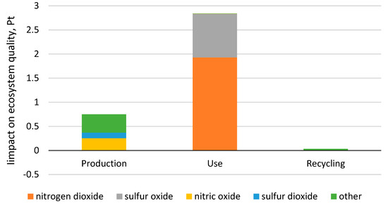 The biggest environmental threat in the category of “ecosystem quality” involves the stage of a car tire’s use, the negative impact of which comes to 2.84 Pt Figure 11. Emissions of nitrogen dioxide and sulfur oxide have a more harmful impact on the ecosystem quality than all the substances analyzed for this impact area, and it is the car tire use stage (more specifically, fuel consumption) that is responsible for this harmful impact. The value of nitrogen dioxide’s impact is 1.93 Pt., whereas that of sulfur oxide is equal to 0.91 Pt. The production stage, in turn, has the highest share of nitric oxide generation and sulfur dioxide generation in the area of environmental impact.