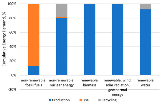 It needs to be emphasized that the energy consumption results were obtained for the European energy mix, of which renewable energy sources still make up only a small share. Switching the energy mix from the European one to a different one, e.g., to that of America, China, or for instance to that of particular European countries such as Poland, France, Germany, or Spain would involve significant changes in energy consumption from particular sources. According to the Ecoinvent 3.2 database, in Poland, 1 kWh of electric energy is produced mainly from hard coal (0.56 kWh) and brown coal (0.37 kWh), which accounts for nearly 91% of all energy sources used in the Polish energy mix. The remaining components of the mix include energy produced from industrial gases, natural gas, hydro energy, and wind energy, as well as others [55]. When it comes to analyzing the French energy mix, it turns out that in this country, most energy comes from nuclear power plants, nearly 80% of it [53].