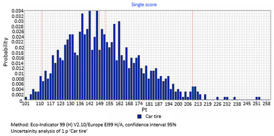 Figure 14 shows the results of uncertainty analysis for the process of a car tire’s production, use, and recycling. The mean value is 153 Pt. The remaining parameters of distribution are the following: Median = 149 kPt, standard deviation = 37.2 Pt, and variability coefficient = 24.3%. Diversification (dispersion) of the final results is relatively small, and it can be stated that the value of the median offers a good reflection of the average level of the phenomenon studied herein (the environmental impact of a car tire’s entire life cycle).