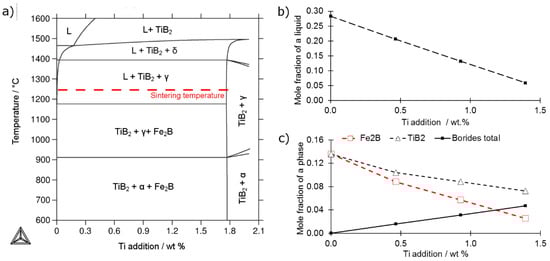 Figure 1b presents the mole fraction of a liquid phase for the constant sintering temperature of 1240 °C, showing a decreasing amount of liquid phase with an increasing titanium addition. This is connected to changes in borides composition due to the replacement of Fe2B by TiB2 borides (Figure 1c). As a result of the difference in molar volume (Fe2B: 16.76 mol/cm3, TiB2: 15.37 mol/cm3) and the difference in metal-boron stoichiometry (each mole of TiB2 contains two times more boron than a mole of Fe2B), titanium diboride is capable of binding the same amount of boron in lesser volume as compared to Fe2B (Figure 1c). Moreover, due to the high melting point of TiB2 it is solid in the sintering temperature; therefore, calculations indicate the decreasing amount of a liquid phase in Figure 1b. For the experimental studies, the compositions of blends (Table 1) were selected based on the presented thermodynamic calculations to assure a considerable but linear decrease of the eutectic liquid amount at the sintering temperature (Figure 1a,b).