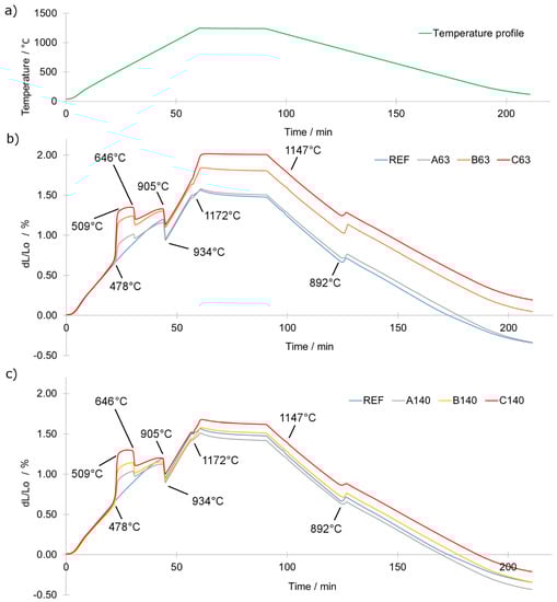 (a) Temperature profile of dilatometric tests; (b) dilatometric curves of samples A63, B63 and C63; (c) dilatometric curves of samples A140, B140 and C140.
