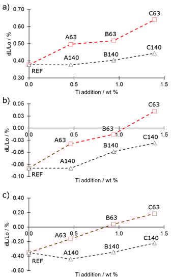 Consequent heating results in the eutectic reaction between iron and boron starting at a temperature around 1172 °C, which is in good agreement with previous studies [8,10]. The presence of the eutectic liquid enhances mass transport causing densification of the material. As a consequence, shrinking becomes a more dominant effect than thermal expansion. This is observed as a length reduction of the sample in the dilatometric curves. This effect is presented in Figure 3a,b in detail. As can be easily seen in Figure 3a,b the more titanium was introduced the higher was swelling at temperatures of eutectic liquid occurrence. This shows that the more titanium was added the less effectively mass transport occurred at a temperature above 1172 °C. Moreover, the total dimensional changes (Figure 3c) show the same trend. The dilatometric results suggest that fine titanium particles reacted more effectively with the eutectic liquid rather than coarse ones.