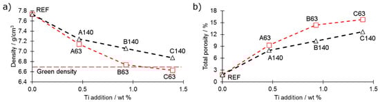 (a) Density changes and (b) porosity in function of the added titanium of Ø20 × 5 mm samples.