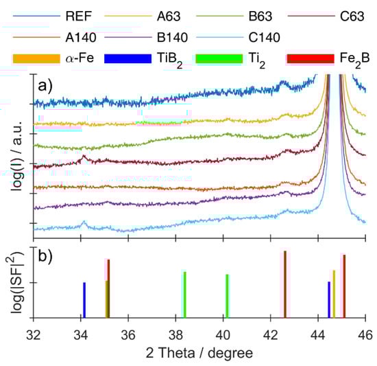 Results of specular X-ray diffraction experiments are shown in Figure 5a together with peak positions from literature in Figure 5b. As a measure for expected intensity, the absolute value of the squared structure factor is used. For clarity, the experimental curves are shifted vertically. A major Bragg peak can be observed at 2 Theta = 44.7°, corresponding to the 110 reflex of the cubic iron phase (a = 2.8665 Å) [23]. Additional peaks of this phase can be found at 65.1°, 82.4°, 99.0° and 116.5°, originating from the (200), (211), (220) and (310) planes (Figure S1 in supplementary data). In the reference sample as well as all samples with titanium addition, additional peaks due to the presence of Fe2B can be observed (35.1° and 42.6°, corresponding to the 200 and 002 plane) [24]. At high titanium concentrations, a simultaneous presence of these peaks and the peak of the 100 reflex of TiB2 [25] can be found. Such observations stay in a good agreement with results of [17,18] who observed the formation of TiB2 at the expense of Fe2B borides in cast iron-based alloys during the solidification process. Moreover, a weak presence of crystalline titanium (40.2°) was noticed, informing that the reaction between titanium and boron was not complete [23].