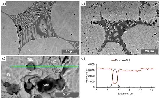 Comparison of observed borides (REF and C63 samples) was presented in Figure 6a,b. Figure 6a shows borides in a network of rib-like structures observed in REF sample, whereas Figure 6b shows interconnected globular structures observed in titanium modified sintered compacts. This change in morphology was caused by crystallization of TiB2 as a result of the reaction of titanium and boron. The crystallisation process requires binding boron from a eutectic liquid resulting in precipitation of iron atoms in surrounding space. As the TiB2 is solid at sintering temperature it consisted a barrier for grain growth. This can be seen as uneven grain boundaries in samples with titanium addition (Figure 6b). Without the presence of titanium, Fe2B crystallizes at lower temperatures as the last phase (Figure 1a), therefore its morphology is determined by already existing spherical grains. Ex situ SEM EDX measurements (Figure 6c,d) after the sintering process showed the presence of small and nearly spherical titanium based particles in all samples with titanium additions. Moreover, the addition of titanium causes separation of previously (REF) connected borides, which enhances the connection among neighbouring grains (figures available in supplementary data in the folder: Eutectics distribution).