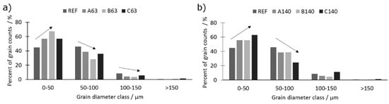 Histograms of grain size distribution for series (a) 63 and (b) 140.