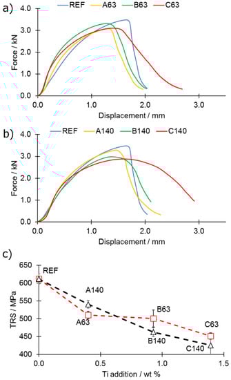 Transverse Rupture Strength (TRS) tests were performed in order to estimate the influence of the changed phase composition on the mechanical behaviour of the samples. The results were presented in a way to highlight the influence of the increasing amount of titanium addition on mechanical behaviour (Figure 9a–c). The results bring the conclusion that high addition of titanium (C-series, 1.40 wt % Ti) causes an increase in the maximum observed deformation on the expense of maximum force (Figure 9a,b) and hence, the TRS as well (Figure 9c). Other additions of titanium (A and B) show intermediate states—samples with 0.47 wt % titanium addition (A) show a decrease of both TRS and maximum deformation, whereas the B-series (0.93 wt % titanium addition) is characterized by lower peak force and higher maximum deformation with respect to the reference sample (Figure 9). The increase of ductility remains in the agreement of the other works [17,18]. The drop of the mechanical properties, however, stays in opposition to the recent findings [17,18]. The increase in ductility of sample (C series) can be attributed to joint effect of few phenomena: (i) the grains are not anymore separated with a network of brittle borides; therefore, grains are connected with each other; (ii) formation of TiB2 reinforces the matrix; (iii) grains are not uniaxial anymore and their shape is irregular; therefore, mutual interlocking is possible. The irregular shape of grains is attributed to the joint effect of grain growth in conditions of solid-state sintering (induced by eutectic phase disappearance) and liquid phase sintering. These changes were possible mainly due to the change of manufacturing process change—in previous works, the casting was used whereas is the present work the liquid phase sintering process was applied. For the densification of the sample, effective mass transport is required, and when the titanium is added, it is impeded as presented in Figure 4, which leads to the drop of the density (in relation to the REF sample).