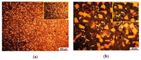 Figure 1. The representative microstructure of the as-cast specimens revealed at different magnifications. (a,b) typical casting microstructures that highlight solid dendrites based on Ag-Pd solid solution. The closer view in the upper right corners reveals structure aspects at higher magnification.