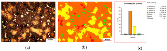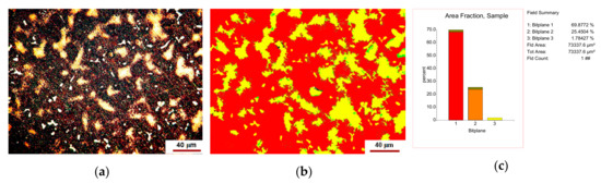 Figure 2. Phase content of the new alloy: (a) original microstructure image; (b) processed image; (c) histogram of the phase contents (% area), i.e., 1—eutectic, 2—solid solution, 3—compounds-yellow shinning ones.