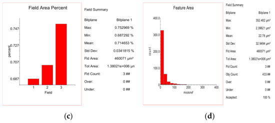 Figure 5. Inclusionary state associated with Figure 2a: (a) original microstructure image; (b) processed image; (c) histogram of the phase distribution; (d) histogram of the inclusion size distribution.