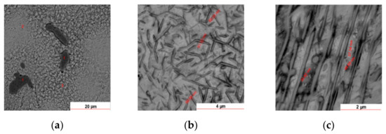 Figure 7 provides a closer look at the microstructure of the as-cast 58Ag24Pd11Cu2Au2Zn1.5In1.5Sn alloy. On the red marked zones in Figure 7, EDS and dimensional measurements were carried on to assess the nature and the extent of the structural heterogeneities. Thus, the needle-like darker entities of about 100 nm in diameter (Figure 7b) include smaller entities of about 50 nm. Onto some areas, the needle-like entities are aligned parallel each-one with an average distance between rods of about 1 µm. The increased content of Cu was expected to give rise to a significant chemical heterogeneity which is supported by the microstructural patterns given in Figure 6 and Figure 7. The EDS measurements on the spotted areas in Figure 7a have confirmed the envisaged heterogeneity as is given in Table 2.