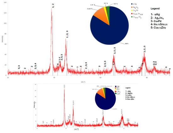The inset pie chart in Figure 9 reveals the phase contents estimated by the Rietvelt method. The identified compounds are Ag9In4, Cu0.7Zn2, Cu4Pd, In0.75Sn0.25. The TOPAS software (version 1.0, PANanalytical B.V., Almelo, The Netherlands was used to estimate the phase content based on the diffractogram given in Figure 9.