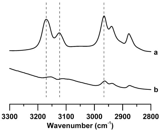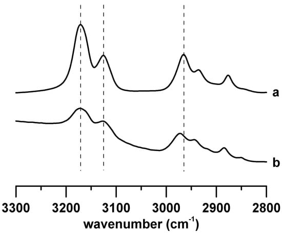 To investigate the interactions between DNA and ILs with various alkyl-chain lengths, combining [C3MIM][PF6] and DNA may provide more hints on the effect of the DNA–IL association. Figure 5 shows the IR spectra of (a) pure [C3MIM][PF6] and the (b) [C3MIM][PF6]/DNA mixture recorded under ambient pressure. The IR spectrum of pure [C3MIM][PF6] in Figure 5a reveals the C–H absorption bands at 3172 (C4,5–H), 3124 (C2–H), and 2965 (alkyl C–H) cm−1. The C–H absorption frequencies of pure [C3MIM][PF6] in Figure 5a are similar to those of pure [C4MIM][PF6] in Figure 1a at ambient pressure. In Figure 5b, the imidazolium C–H (C4,5–H and C2–H) band frequencies of the [C3MIM][PF6]/DNA mixture show slight frequency shifts compared with those of pure [C3MIM][PF6] in Figure 5a. The imidazolium C–H frequency shifts induced by DNA in Figure 5 are fairly small in comparison with those for [C4MIM][PF6]/DNA in Figure 1. Thus, the weak associated configurations with DNA may be the dominant species for the [C3MIM][PF6]/DNA mixture instead of the species of strong complexation for [C4MIM][PF6]/DNA. It should be noted that the alkyl C–H band at 2972 cm−1 of the [C3MIM][PF6]/DNA mixture in Figure 5b shows a mild blue shift in comparison with the alkyl C–H absorption band of pure [C3MIM][PF6] in Figure 5a. The band shifts of alkyl C–H for pure [C3MIM][PF6] and the [C3MIM][PF6]/DNA mixture in Figure 5 may be attributed to the local structure changes of the alkyl C–H groups induced by the presence of DNA molecules.