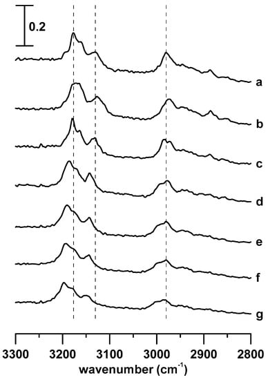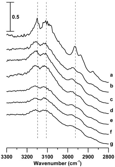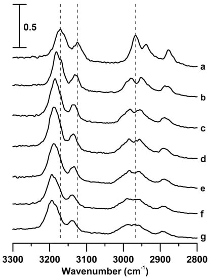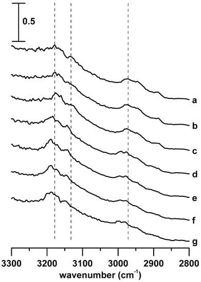 Figure 3 shows the IR spectra of the [C4MIM][PF6]/DNA mixture obtained at (a) ambient pressure and (b) 0.4, (c) 0.7, (d) 1.1, (e) 1.5, (f) 1.8, and (g) 2.5 GPa. As shown in Figure 3, baseline absorption is present for the [C4MIM][PF6]/DNA mixture in all of the spectra (Figure 3a–g), which is attributed to the absorption bands of hydrogen-bonded O–H or N–H. With the increase of pressure to 0.4 GPa, the C2–H and C4,5–H absorption bands reveal mild blue shifts to 3115 and 3158 cm−1, respectively (Figure 3b). The alkyl C–H bands in the range from 2850 to 3000 cm−1 are also blue-shifted because of the pressure increase (Figure 3b). In agreement with our experimental results, several researchers [,,,,] suggested that [C4MIM]+ cations can be easily bound into the minor groove structure of DNA molecules by the electrostatic force and van der Waals interactions. In comparison with pure [C4MIM][PF6] at the pressure of 0.4 GPa (Figure 2b), the C2–H and C4,5–H absorption bands of [C4MIM][PF6]/DNA mixture at 0.4 GPa (Figure 3b) show smaller frequency shifts under compression. Previous studies [,,] revealed that high pressure can enhance the cluster structure interaction and lead to a band frequency shift. The hydrogen-bond network of an IL cluster structure may be disrupted, as some added molecules (such as DNA) may disturb the associations of ILs or cut large aggregations to small pieces. With the further increase of pressure from 0.4 to 2.5 GPa (Figure 3b–g), the C–H bands do not show significant frequency shifts; however, the C–H absorption bands reveal subtle-continuous band-broadening. DNA may protect imidazolium cations from approaching molecules or ions under applied pressure, which makes the associated [C4MIM][PF6]/DNA structure stable under up to 2.5 GPa pressure.