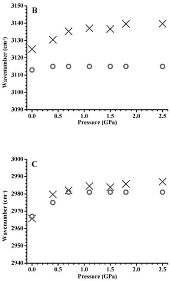 Figure 8 shows the pressure dependence of the C–H stretching frequencies of pure [C3MIM][PF6] and the [C3MIM][PF6]/DNA mixture. The C4,5–H and C2–H stretching bands (Figure 8A,B) of pure [C3MIM][PF6] and the [C3MIM][PF6]/DNA mixture show similar band-shift tendencies under compression. The imidazolium band-shift results of [C3MIM][PF6]/DNA in Figure 8A,B are remarkably different from those of [C4MIM][PF6]/DNA in Figure 4A,B. The differences may be attributed to the stronger association between [C3MIM]+ and [PF6]− caused by more symmetric and easier packing of [C3MIM]+ than that of [C4MIM]+. Namely, cations with short alkyl side chain may favor the local cation–anion structures at high pressures. Cations with a longer alkyl side chain may lead to larger binding forces with DNA. This observation is consistent with the arguments reported in the literature [,]. In other words, the difference in alkyl side chain lengths may cause various effects on the stabilization of IL/DNA associations at high pressures. Figure 8C shows the pressure dependence of alkyl C–H band shifts for pure [C3MIM][PF6] and the [C3MIM][PF6]/DNA mixture. The splitting of the alkyl C–H band for pure [C3MIM][PF6] occurs at the pressure of 0.7 GPa. The splitting may be attributed to the phase transition and pressure-induced local structural organization. For [C3MIM][PF6]/DNA, the pressure required to split the alkyl C–H band changed to 1.1 GPa (Figure 6C). Thus, the presence of DNA indeed disturbs the local structure of alkyl C–H groups of cations in a [C3MIM][PF6]/DNA mixture.