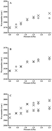 Pressure dependence of the C4,5–H (A), C2–H (B), and alkyl C–H (C) stretching frequencies of pure [C3MIM][PF6] (cross) and the [C3MIM][PF6]/DNA mixture (circles).