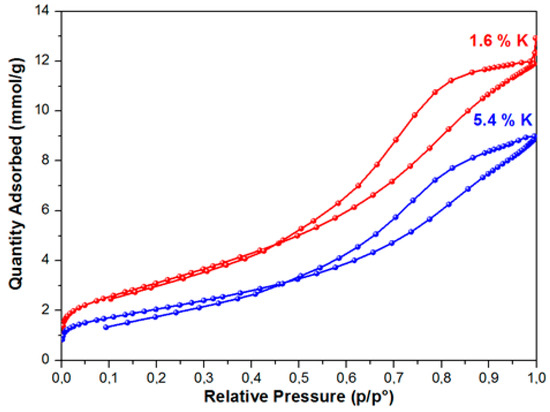 In the range of relative pressures over 40 %, the adsorption-desorption isotherms exhibited pronounced hysteresis. This type of the isotherm points to the presence of mesopores on the surface of the samples under study, as well as the presence of reversible capillary condensation in adsorbent mesopores. The following was determined for the samples under study while using the isotherms of low-temperature adsorption and desorption of nitrogen: specific surface area, porosity, and pore size distribution. During the modification of the aluminium oxide material with the atoms of alkaline metals (Li, Na, K), texture characteristics of the material change—along with the increase of the modifying metal content, the specific surface of the material and the total pore volume decrease. The greatest decrease of Ssp, which was calculated while using the weight percent of metal content, was observed in the samples modified with lithium, the least, with potassium. Thus, for example, with the modifying metal content equal to 2.6 wt %, for samples that were modified with lithium, the surface of the initial Al2O3, amounting to 290 m2/g, approximately decreased by up to 120 m2/g, i.e., 2.4 times (Figure 2), whereas a decrease in the specific surface was ~40% and ~17%, respectively, for samples that were modified with sodium and potassium.