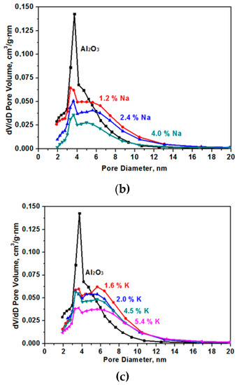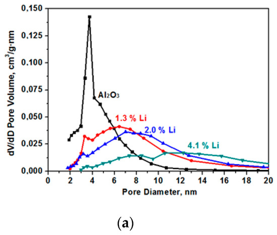 The specific surface decreases as a result of sintering in the presence of alkaline cations [14]. The data on pore size distribution in the samples that are presented in Figure 3 show the presence of only small mesopores in the samples. In the initial (Al2O3) sample, the average pore size was 4.7 nm with a strongly pronounced peak in the range of the pore diameter equal to 3.8 nm. As a result of samples modification, the number of fine pores decreases and the number of larger pores increases.