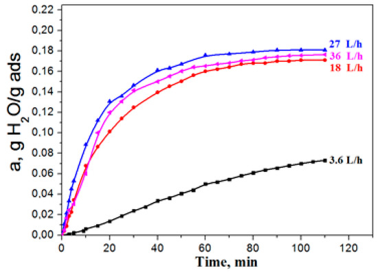 The growth of the adsorption capacity, along with the increase in the flow rate, points to the fact that the process proceeds in the area of influence of external diffusion, i.e., the rate of water vapour delivery from the flow to the adsorbent surface limits the adsorption rate as a whole is limited (external diffusion to exterior surface of particle). With the increase in the flow rate, in the range of 25–35 L /min the adsorption capacity of the sample did not depend on the consumption, and it can be concluded that the adsorption process takes place in the kinetic mode. Therefore, all of the experiments presented further were made at a flow consumption of 30 L/h.