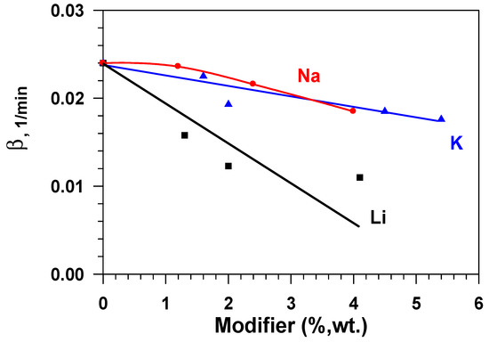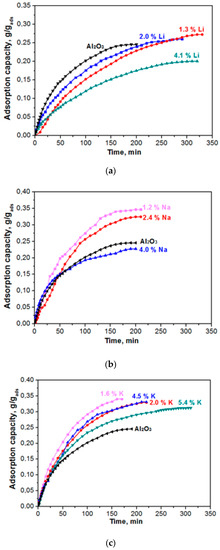 Figure 8 presents dependences of the constant of the water adsorption rate (β) on the modifier concentration (Li, Na, K) in aluminium oxide while taking the fact that the effectiveness of the adsorbent layer is determined by not only static (equilibrium) capacity, but also the adsorption rate, into account. These data show that the adsorption rate constant that is calculated by Equation (4) decreases sharply with the growth in the modifier content for samples doped by lithium and, to a lesser degree, for samples containing sodium and potassium. Consequently, samples that are modified with sodium or potassium have a higher equilibrium capacity, as compared to the initial sample (Al2O3), and a quite high rate of adsorption in relation to water vapours.