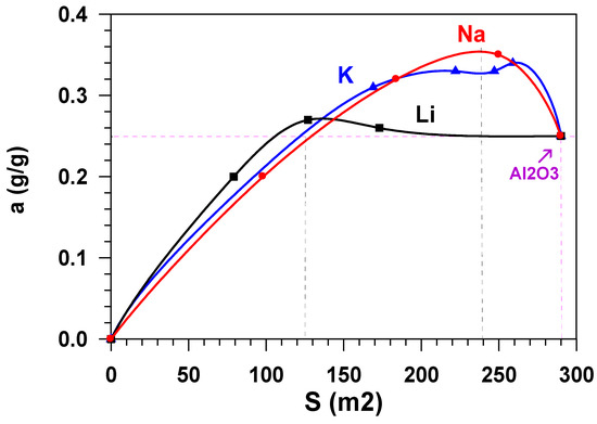 The growth in the adsorption capacity of the samples, when the content of alkaline metals cations increases (Figure 6) is accompanied by the decrease in their specific surface. Figure 7 shows the dependence of the equilibrium adsorption capacity of the modified materials (a*) on the specific surface (Ssp). When modifying Al2O3 with alkaline metals, the specific surface decreases (Figure 2), but the adsorption ability of the material surface unit increases. It is possible to note that modification with lithium does not practically influence the adsorption capacity. At the same time, the dependence of the capacity of samples, modified with potassium and sodium, on the specific surface is of extreme nature in the range of change Ssp = 125–290 m2/g. The maximum value of the equilibrium adsorption capacity is observed in the range of Ssp = 240 ± 24 m2/g. This value of the specific surface (shown in Figure 2 as a horizontal dotted line) is provided by modification of the initial material with 1.2 wt % of sodium or with 2.6 wt % of potassium (shown in Figure 2 as vertical dotted lines). While taking the molecular weight of sodium (23 g/mole) and potassium (39 g/mole) into account, this approximately amounts to an identical value that is equal to 5.2⋅10−4 and 6.8⋅10−4 moles per gram, respectively. When considering the fact that the number of atoms–active sites–in the monolayer (ML) is approximately equal to 1019 atoms per square meter [18,19], the number of active sites on the surface of Al2O3 modified with sodium is ~0.13ML, with potassium being 0.17 ML. Let us note that, at the same value of the specific surface (Ssp = 240 m2/g.), the weight content of lithium in the sample is 0.8 wt % (Figure 2), which amounts to 0.3 ML, i.e., 30 %.