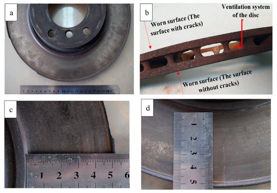 (a,b) Optical images of the disc and (c,d) images of the cracks at the surface of the brake disc.