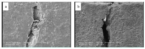 Scanning electron microscope (SEM) images of the crack, in (a) top view and (b) cross-section.