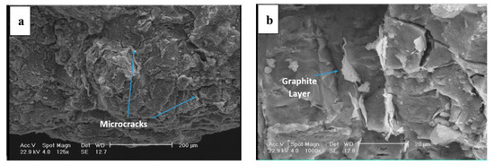 Figure 6 shows the fracture surface of the disc. Fracture is overall brittle with a layered structure (see Figure 6a). The fracture surface was covered with a network of fine microcracks. The interface of matrix-graphite, in which matrix is referred to pearlite, is a suitable place for crack initiation, given that the adhesion of graphite to the iron-based structure is rather weak. An example is depicted in Figure 6b. It appears that the fracture had mostly initiated from the graphite/matrix interface. Figure 7 shows that the fracture surface in some areas is covered with fine agglomerated particles. EDS results show that these particles were mostly Fe- and Si-containing oxide particles. These particles were formed during the wear of the surface and detachment of the particles. This is while the high temperature of the disc during the contact of the pad and the disc resulted in the diffusion of the oxygen atoms into the lattice and the oxidation of the particles. Fine oxide particles have relatively higher hardness compared to the matrix. These particles can cause severe abrasion in case they are entrapped between two moving components, which in this case for the brake pad and the disc. The formation of fine oxide particles between the brake pad and the disc had to do with localized temperature increase due to the excessive friction at local contact points between the pad and the disc.