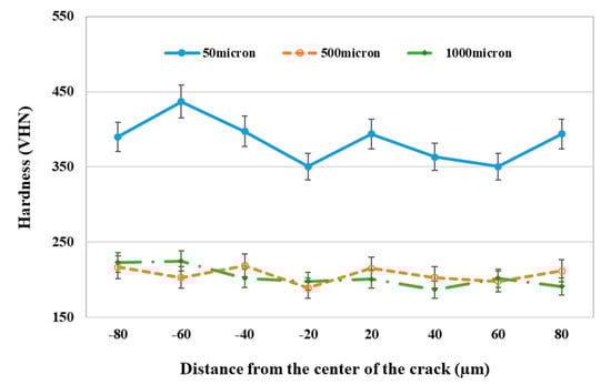 Results of microhardness profilometry across the crack at different depths from the surface are shown in Figure 8. Disc brakes experience large surface compression stresses due to exerted loads from the brake pad. This results in plastic deformation and work hardening at layers close to the surface. In this case, this resulted in an increase in the hardness from about 200 VHN at deep layers inside the brake disc to 400 VHN in layers close to the surface. This increase in the hardness confirmed the argument that the surface was heavily deformed and work-hardened during service. Prasad [4] also reported the occurrence of work hardening in gray cast iron discs during a wear test. The depth of the work-hardened layer was dependent on the loading conditions, the sliding distance (service time), and the temperature increase at local contact points.