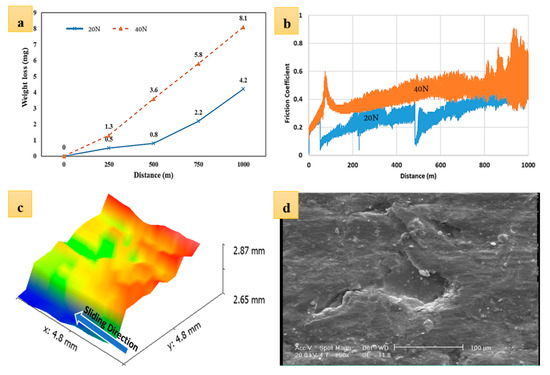 Results of the wear test: (a) weight loss with sliding distance, (b) variation of friction coefficient with sliding distance, (c) laser profilometry of the sample after 1000 m wear test under 40 N load, and (d) SEM image of the same sample.