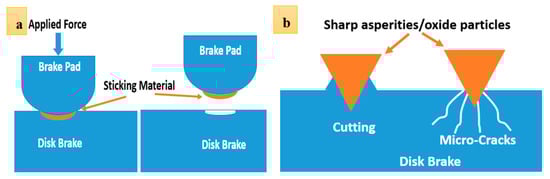 Schematics of (a) adhesive wear and (b) abrasive wear mechanisms.