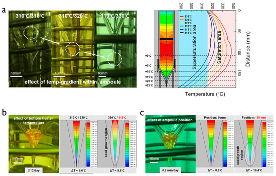 Figure 2c), the temperature difference was changed from 8.6 to 16.4 °C by lowering the ampoule position, which was more effective for causing a high temperature difference. Such an abrupt temperature difference of the seed crystal confines the region of the crystal growth to the end of the ampoule tip, narrowing the nucleation boundary and thereby leading to a stable growth mode.