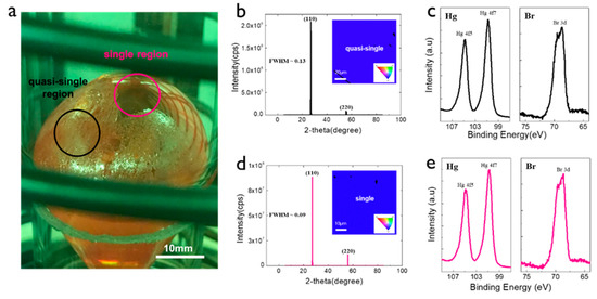 20]. The binding energies of Hg 4f7 and Br 3d in the quasi-single crystal were 100.8 eV and 68.9 eV, respectively, and the peak positions of the single crystal were observed at 100.7 eV and 68.7 eV. There was no remarkable difference in the XPS peak positions for the two samples. Even if there was lattice distortion in the quasi-single crystal, the chemical compound states remained the same regardless of the growth region.