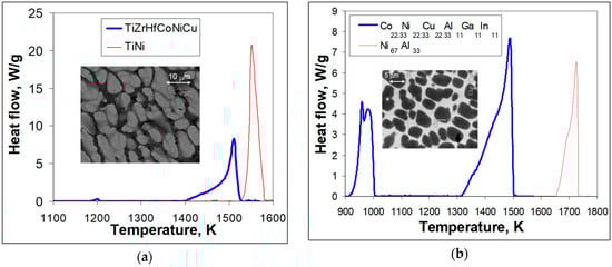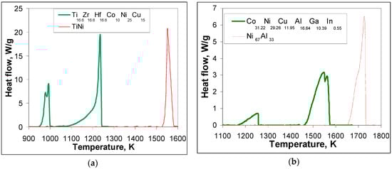 Figure 2 shows heat releases upon cooling from the liquid state followed by crystallization for Ti16.67Zr16.67Hf16.67Co10Ni25Cu15 (Figure 2a) and Co31.22Ni29.26Cu11.95Al16.64Ga10.39In0.55 multicomponent intermetallic compounds (Figure 2b) as compared to equiatomic TiNi (Figure 2a) and non-stoichiometric Ni67Al33 (Figure 2b), respectively.