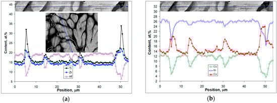 The inset in the center of Figure 4a demonstrates the as-cast Ti16.67Zr16.67Hf16.67Co10Ni25Cu15 microstructure. The arrowed line appearing in both insets marks the same position, which was used to record EDX line scan data. The upper part of Figure 4a represents a higher magnification detail of the microstructure alongside the arrowed line that corresponds to the concentration profiles of Ti, Zr and Hf obtained from the EDX analysis. Figure 4b is structured similarly but represents the data for the Co, Ni and Cu concentration profiles. The line scan goes across two black precipitates, which are several micrometer thick and follows a martensite crystal that starts from one precipitate and stops at the other. Black in the back-scattered electron image corresponds to the area with lowest average atomic number (so-called Z contrast). From the scan data it was determined that the composition of the black appearing phase is (Ti32Zr21.5Hf8.5)62(Co4Ni17Cu17)38, which is in accordance with the findings shown in Figure 1a, where the phase of the Ti2Ni type was also found. On the right hand side of the scan (positioned at 45–49 μm in Figure 1) there is another area that is brighter and possesses a composition of (Ti21Zr20Hf9)50(Co5Ni21Cu24)50. The latter is the one that seems to be belonging to the B2 phase as no martensite crystals are seen in it. Yet, both compositions are not the major ones in the scan under consideration. Brighter patches about 10 μm long (upper inset in Figure 4) belong to dendrites with the composition (Ti14.7Zr13.6Hf19.5)47.8(Co13Ni26.2Cu13)52.2 and are filled by martensitic crystals (Figure 4a, central inset). The areas in between them that are few micrometer thick have the composition (Ti19Zr17.4Hf12.4)48.8(Co7.9Ni24.4Cu18.9)52.2, which is just in between the composition of the dendrites and dark appearing area ((Ti21Zr20Hf9)50(Co5Ni21Cu24)50).