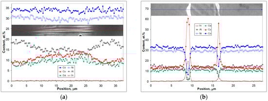It can be seen that the scan line in Figure 5a starts in a dark appearing region belonging to a dendrite and enters a brighter interdendritic region filled with martensite crystals. It passes through an individual 20-μm long martensite crystal, which stays within the interdendritic region. At the position where the scan line enters another dark appearing dendrite, the martensite crystal seems to stop from entering it. Other martensite crystals nearby display similar behavior (see also Figure 3b). Figure 5b shows a scan that goes through an interdendritic region. It crosses two bright appearing phases, which according to the data shown in Figure 5b have a composition of Co6.4Ni10.6Cu60.7Al1.4Ga1.7In19.2. This is close to the one of the Cu9In4 type found in [17]. The average composition of the dendrites shown in Figure 5a is (Co33.9Ni30.5Cu9.4)73.8(Al18.2Ga7.9In0.1)26.2. It changes smoothly in Figure 5a, as the scan is moving into the interdendritic area and undergoes a clear decrease in Al content, slight decrease in Co and Ni and a definite increase in Cu and Ga. The average composition of the interdendritic region extracted from the data in Figure 5b is (Co32.7Ni29.4Cu13.3)75.4(Al13.8Ga10.6In0.2)24.6.