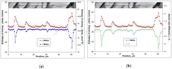 Changes along the EDX line scan shown in Figure 4 within the as-cast Ti16.67Zr16.67Hf16.67Co10Ni25Cu15 for: (a) enthalpy (closed circles) and entropy (closed triangles) of mixing calculated as described for Table 2 according to [22,23]; (b) enthalpy of mixing (closed circles) and atomic size difference (open circles) calculated according to [23].
