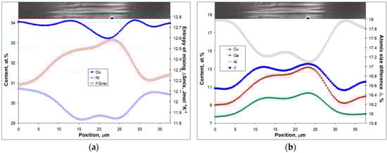 Variation of key parameters along the EDX line scan shown in Figure 5a within the as-cast Co31.22Ni29.26Cu11.95Al16.64Ga10.39In0.55: (a) smoothened concentration profiles of Co (closed circles), Ni (open circles) and entropy of mixing calculated as described for Table 2 according to [23] (open boxes); (b) smoothened Cu (closed triangles), Ga (closed circles), Al (open boxes) concentration profiles, and atomic size difference (closed boxes) calculated according to [23].