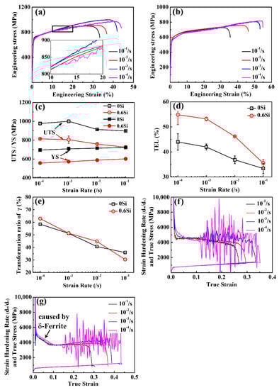 The stress-strain curves of 0Si (a) and 0.6Si (b); ultimate tensile strength (UTS) and yield strength (YS) (c), total elongation (TEL) (d), and reverted γ transformation ratio (e) at different strain rates in both 0Si and 0.6Si; the true stress-true strain curves and strain hardening rate curves of 0Si (f) and 0.6Si (g).