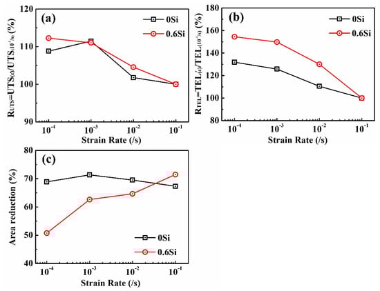 In general, the strain rate has a great influence on the mechanical properties of steel. The ratio of UTS (RUTS) and TEL (RTEL) at different strain rates to those at a strain rate of 10−1/s and the area reduction in both 0Si and 0.6Si were investigated (Figure 3). Regardless of the Si content, RUTS and RTEL decrease as the strain rate increases (Figure 3a,b). RUTS is almost the same in both 0Si and 0.6Si, whereas RTEL is higher in 0.6Si than in 0Si, showing that TEL decreases faster in 0.6Si than in 0Si as the strain rate increases. As shown in Figure 3c, the area reduction of 0Si is independent of the strain rate. However, the area reduction of 0.6Si increases as the strain rate increases. The results strongly suggest that δ-ferrite promotes heterogeneous deformation in the neck region as the strain rate increases. Meanwhile, the area reduction is lower in 0.6Si than in 0Si, except when the strain rate is 10−1/s.