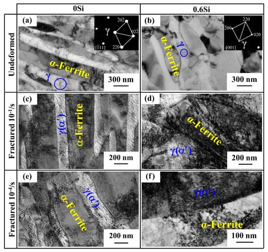 TEM observation was used to analyze the influence of strain rate on microstructure evolution. For both 0Si and 0.6Si, the morphology of reverted γ and α-ferrite is mainly lathy. Meanwhile, undeformed microstructures note minimal dislocations (Figure 4a,b). Deformed microstructures of 0Si at strain rates of 10−1/s and 10−4/s are shown in Figure 4c,e, respectively. Regardless of the strain rate, the fractured samples express a high density of dislocations. Deformed microstructures of 0.6Si at strain rates of 10−1/s and 10−4/s are shown in Figure 4d,f, respectively. Apparently, regardless of the strain rate, the dislocation density is much higher in 0.6Si than in 0Si, and the dislocation density is slightly higher in 0.6Si at a strain rate of 10−1/s. These results strongly indicate that the deformed microstructure of reverted γ+α-ferrite is similar, except for the higher dislocation density in 0.6Si.