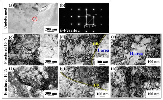 TEM observation of δ-ferrite in 0.6Si: undeformed microstructure (a), electron diffraction spot of selected area (black circle in a) (b), and deformed microstructure of fractured specimens (c–h) at different strain rates, 10−1/s (c–e) and 10−4/s (f–h).