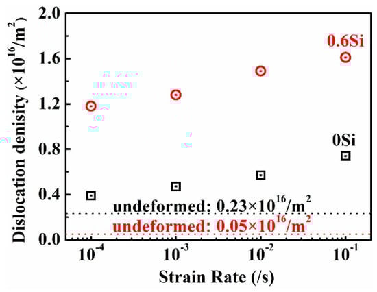 The dislocation density of fractured specimens of both 0Si and 0.6Si at different strain rates; the black and red dotted lines represent the dislocation densities of undeformed 0Si and 0.6Si, respectively.